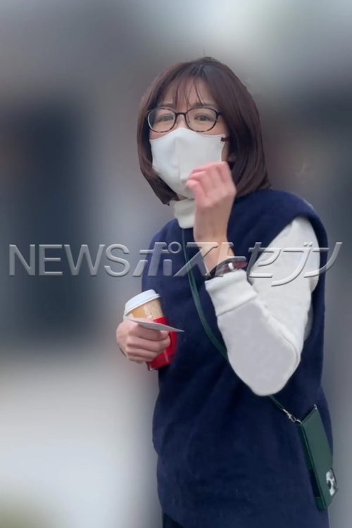 香川県・丸亀市。ネイビーのニットとパンツを合わせた上品なスタイルで、高級車から降りてきた女性。マスク姿だが、くっきりとした目元は“アイドルアナウンサー時代”と同様に輝いている。