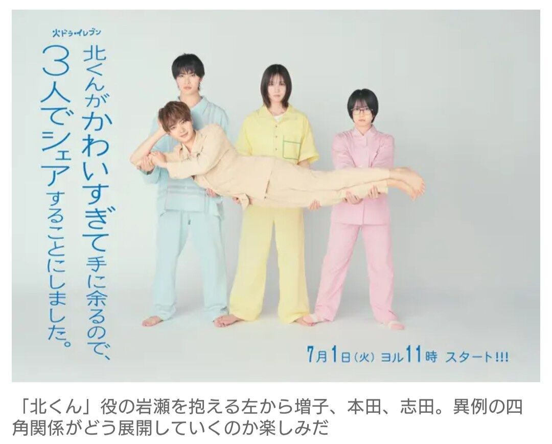 主人公ら3人が彼氏をシェアするラブコメディー。彼氏の「北くん」を演じる俳優、岩瀬洋志(21)や女優、志田未来(32)、男女7人組、GENICの増子敦貴(25)と四角関係を描く。