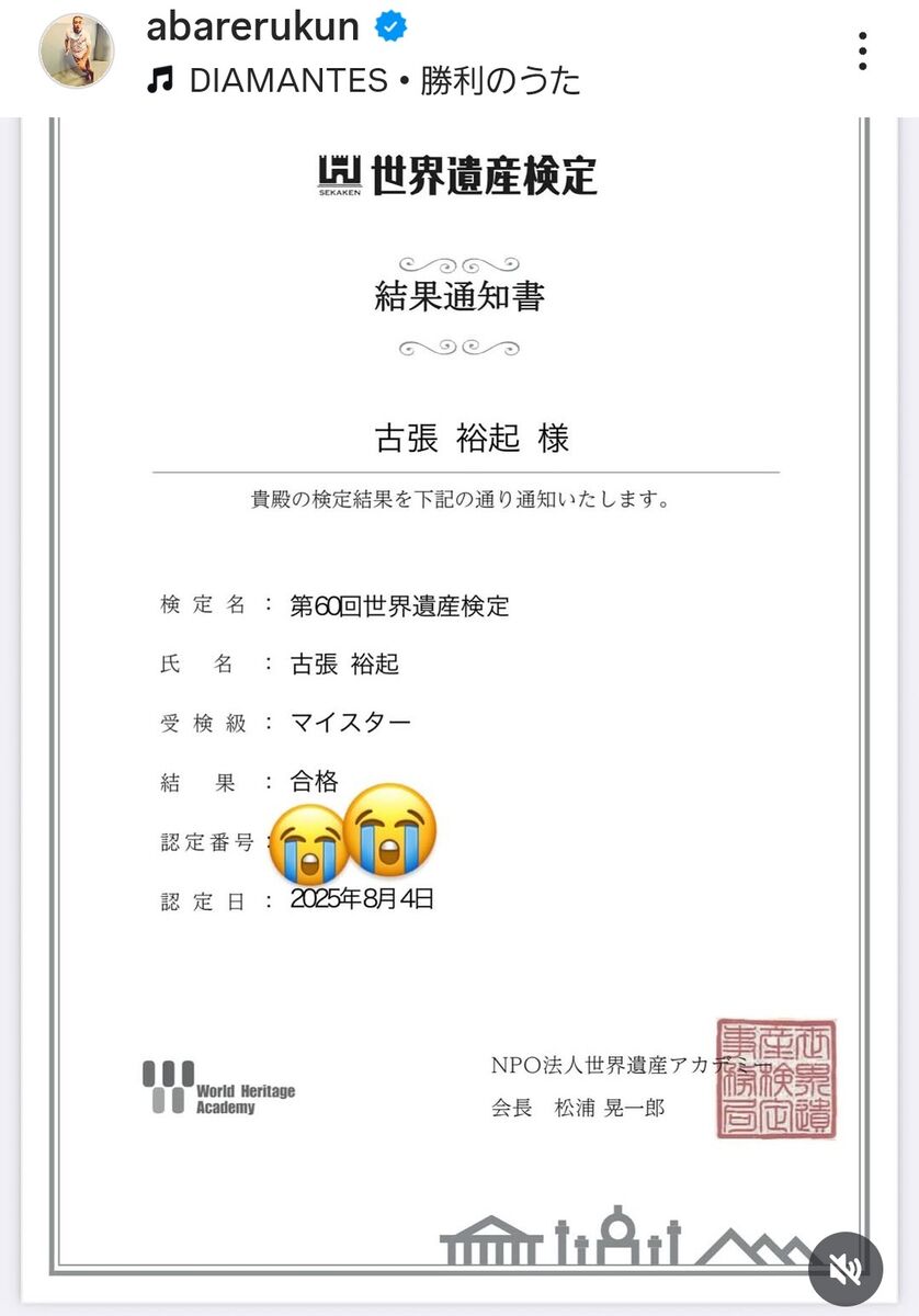 世界遺産検定は、下から順に4級、3級、2級、準1級、1級、マイスターと各級があり、あばれる君は2022年に世界遺産検定1級を取得。今回合格したのは、最上位の「マイスター」で、公式サイトによると「世界遺産条約の理念や諸概念を理解し、世界遺産に関する諸事象について自分の意見をもつ」という学習内容だという。