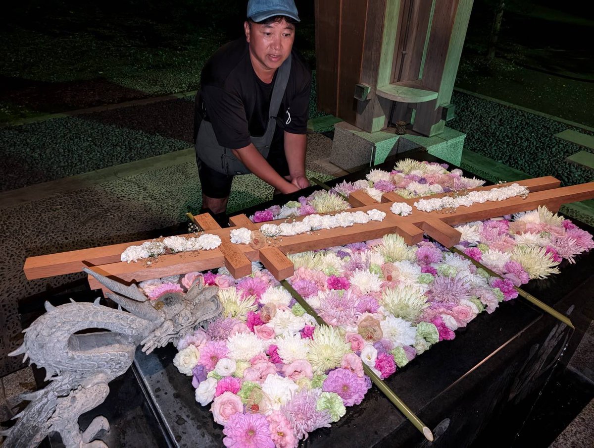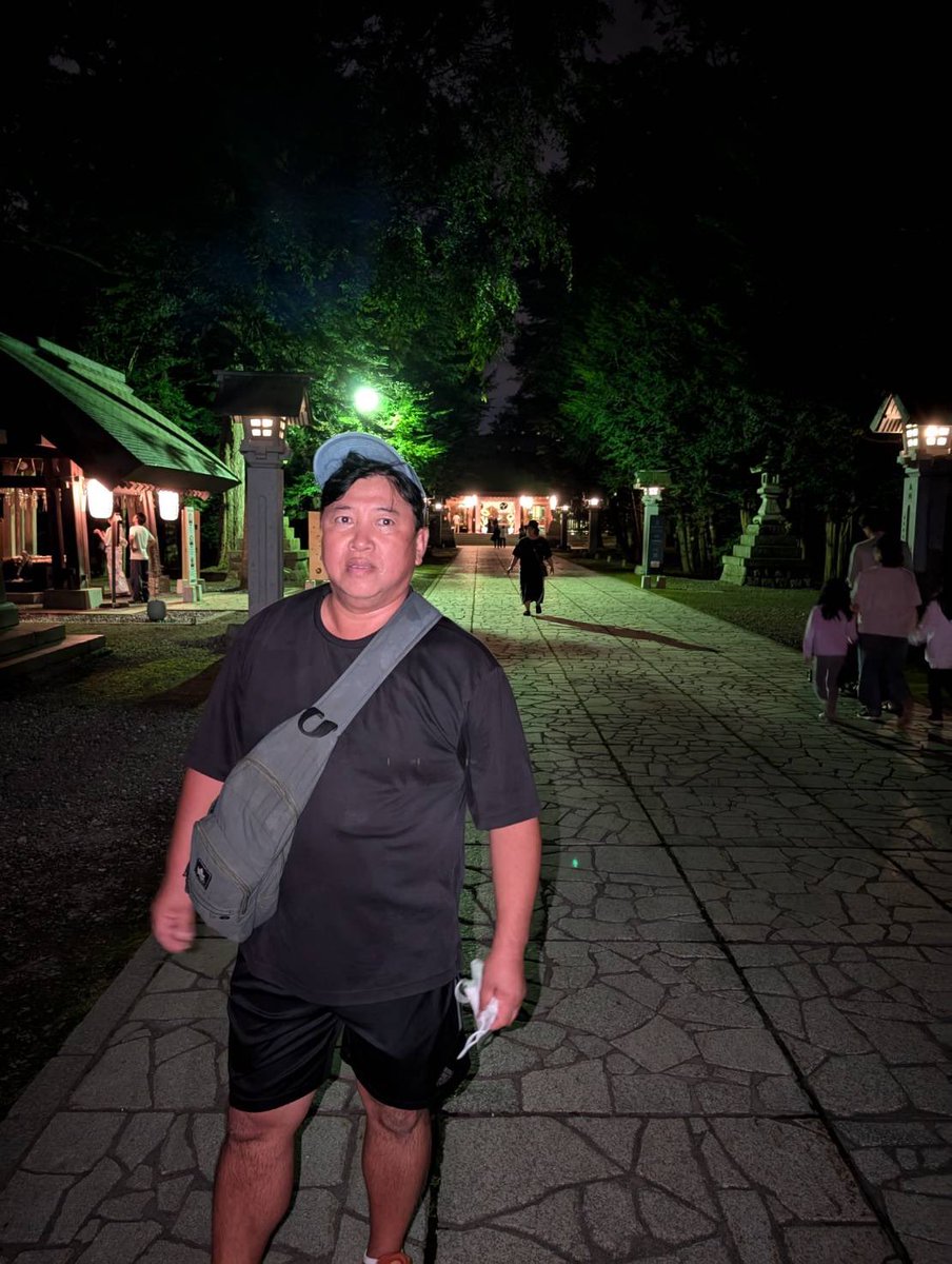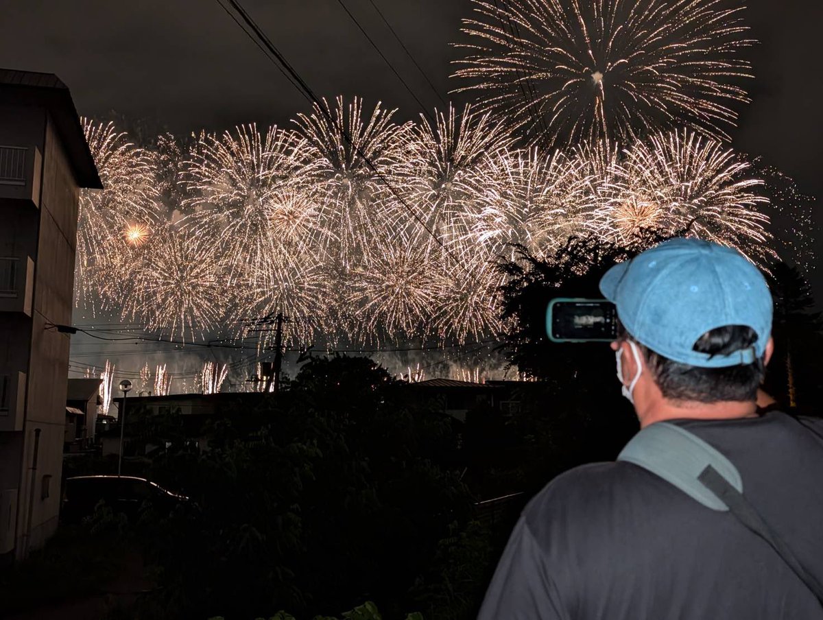 「13日の当日の飛行機に乗って夜到着便でやってきて、そのままバスに乗りレンタカー借りるところまで行き、車に乗り知り合いの駐車場に止めさせてもらいダッシュで花火会場のよく見えるところまでダッシュ」