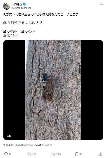 山口氏は木にセミがとまり、鳴いているショート動画を添付。「何があっても今生きている事は奇跡なんだと、ふと思う」と書き出した。