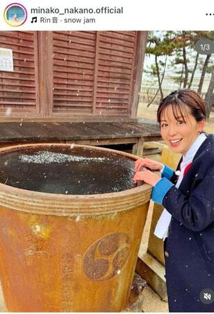 雪の降る中、凍った樽の水に触れる写真などを投稿し、「香川のとある場所にて撮影でした。ここ数年で1番っていうくらいの寒さでしたが 楽しいスタッフと美味しいものに囲まれて、心はポカポカ、元気もらいました!」と報告。「#神社の水が凍ってました #寒波到来 #瀬戸内海は今日も穏やかです」などと記した。
