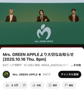 Mrs. GREEN APPLEの『大切なお知らせ』がこちらwwwww 1: 名無し 2025/10/16(木) 20:22:01.81 ID:7jmLGCWv9 https://news.yahoo.co.jp/art […]