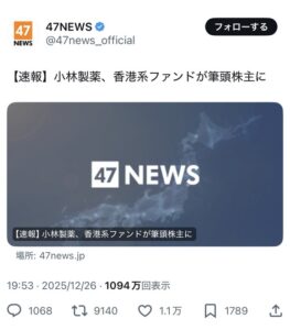 【悲報】小林製薬、乗っ取り完了 1: 名無し 2025/12/27(土) 17:32:16.61 ID:mwzS/Ybc0 あっ 4: 名無し 2025/12/27(土) 17:33:29.07 ID:DNLWrNV90 […]