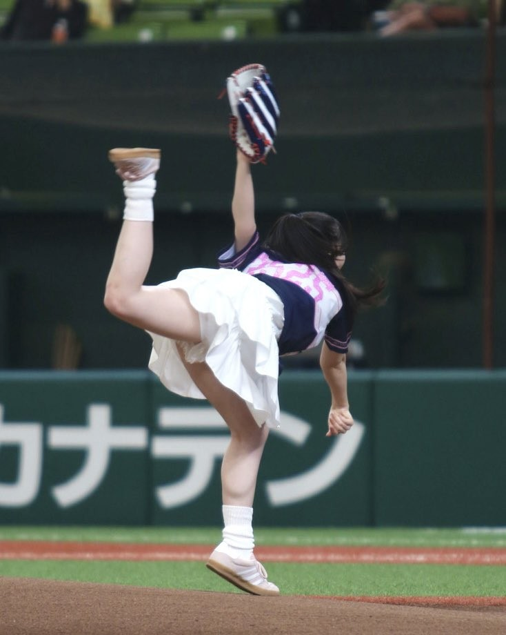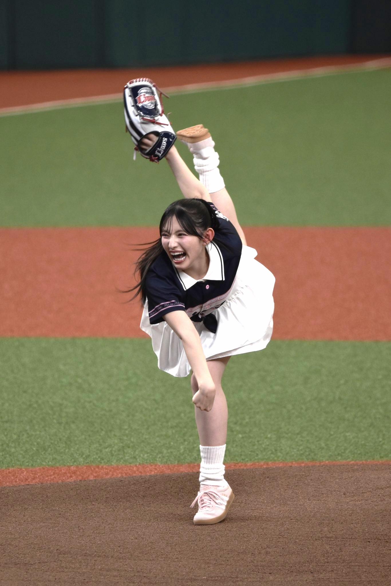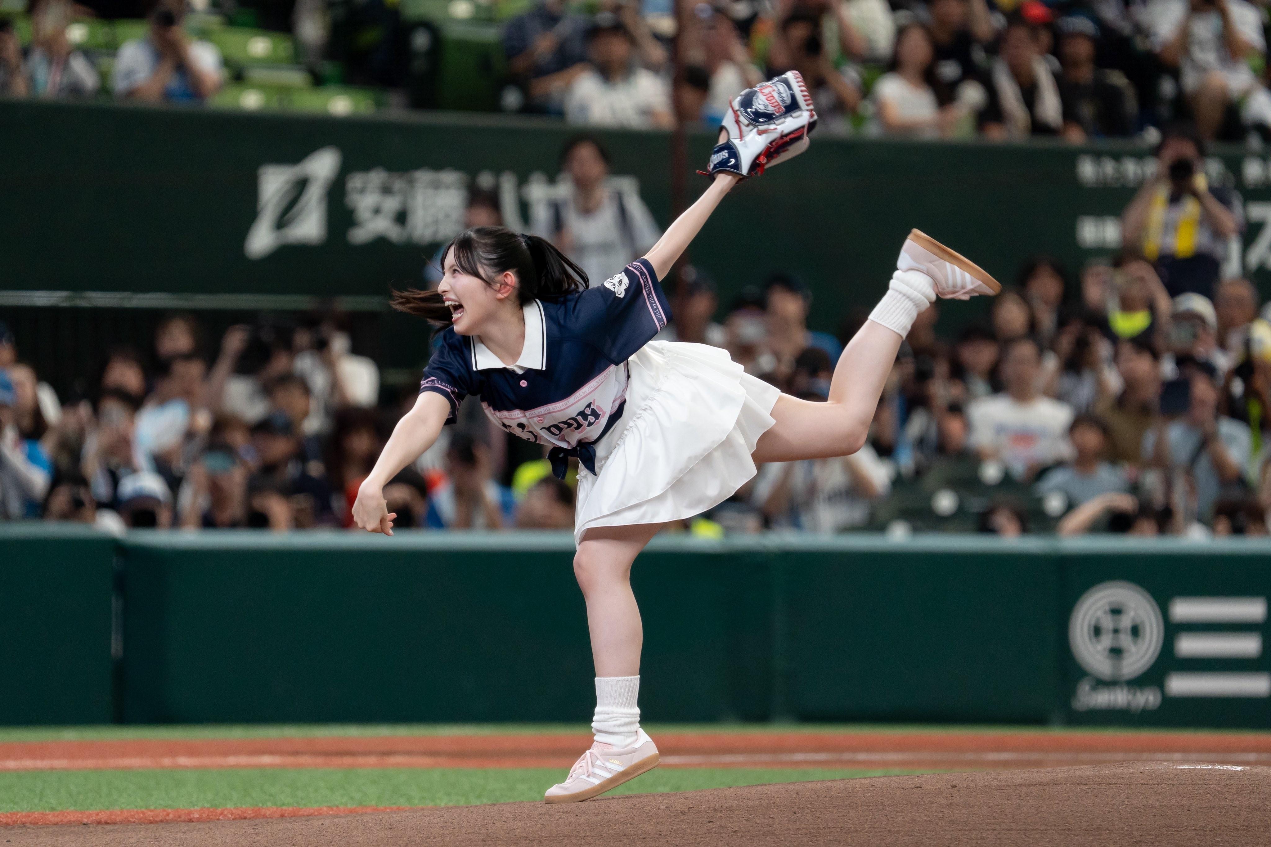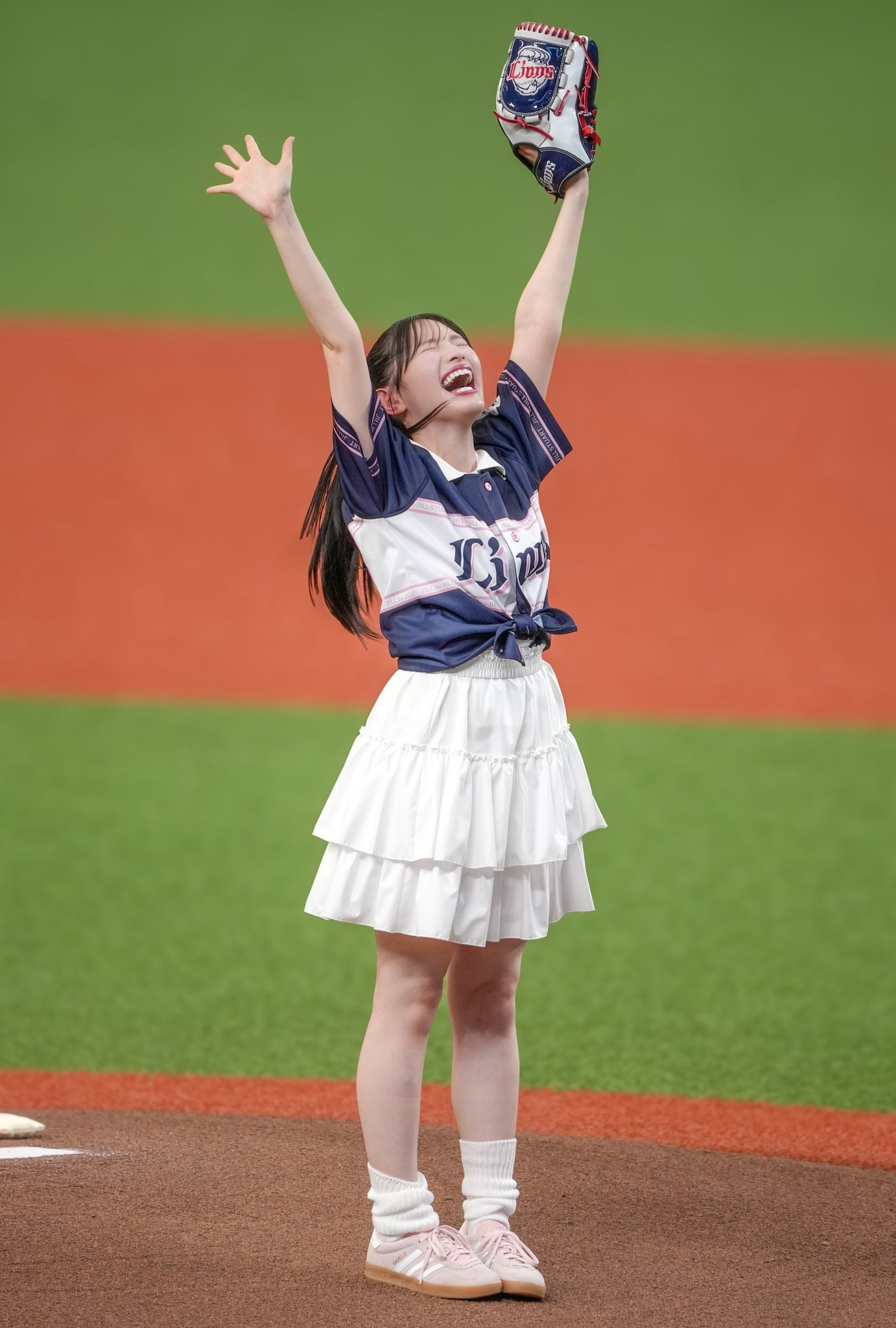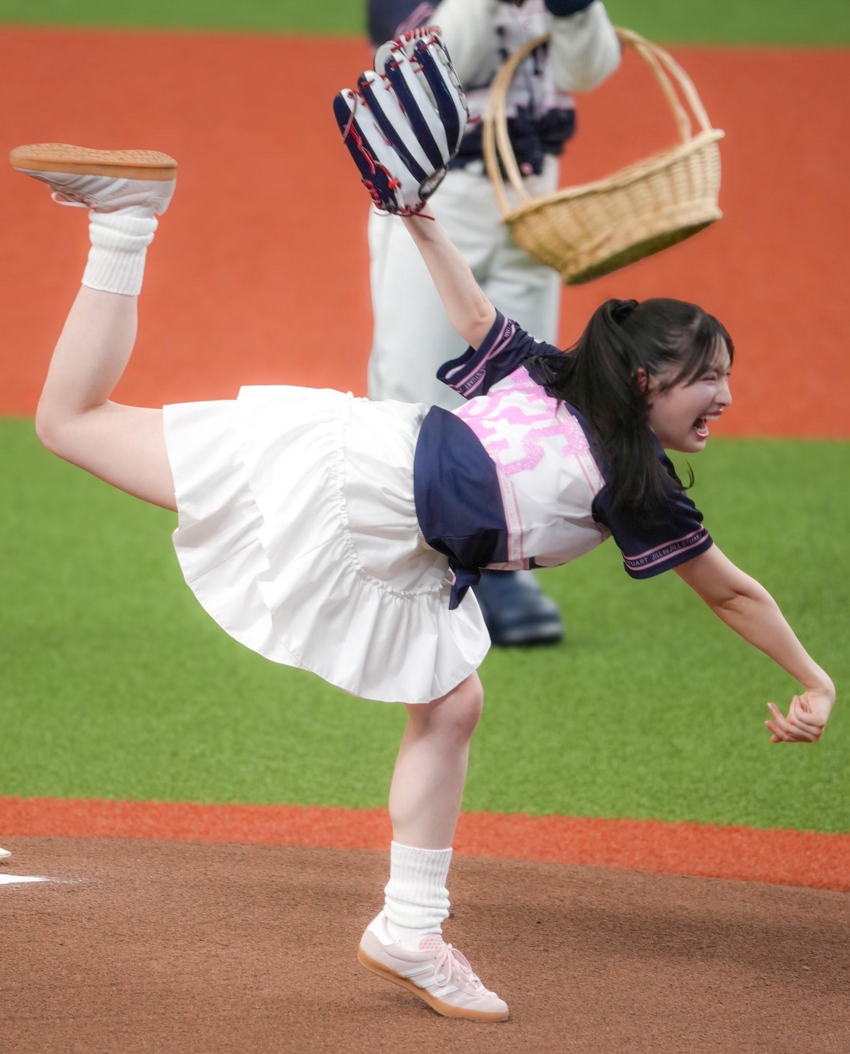 人気アイドルが白スカートで豪快投球 ピョンピョン大喜び…限定ユニ姿で球場虜