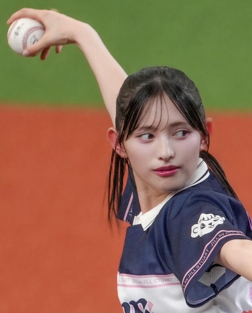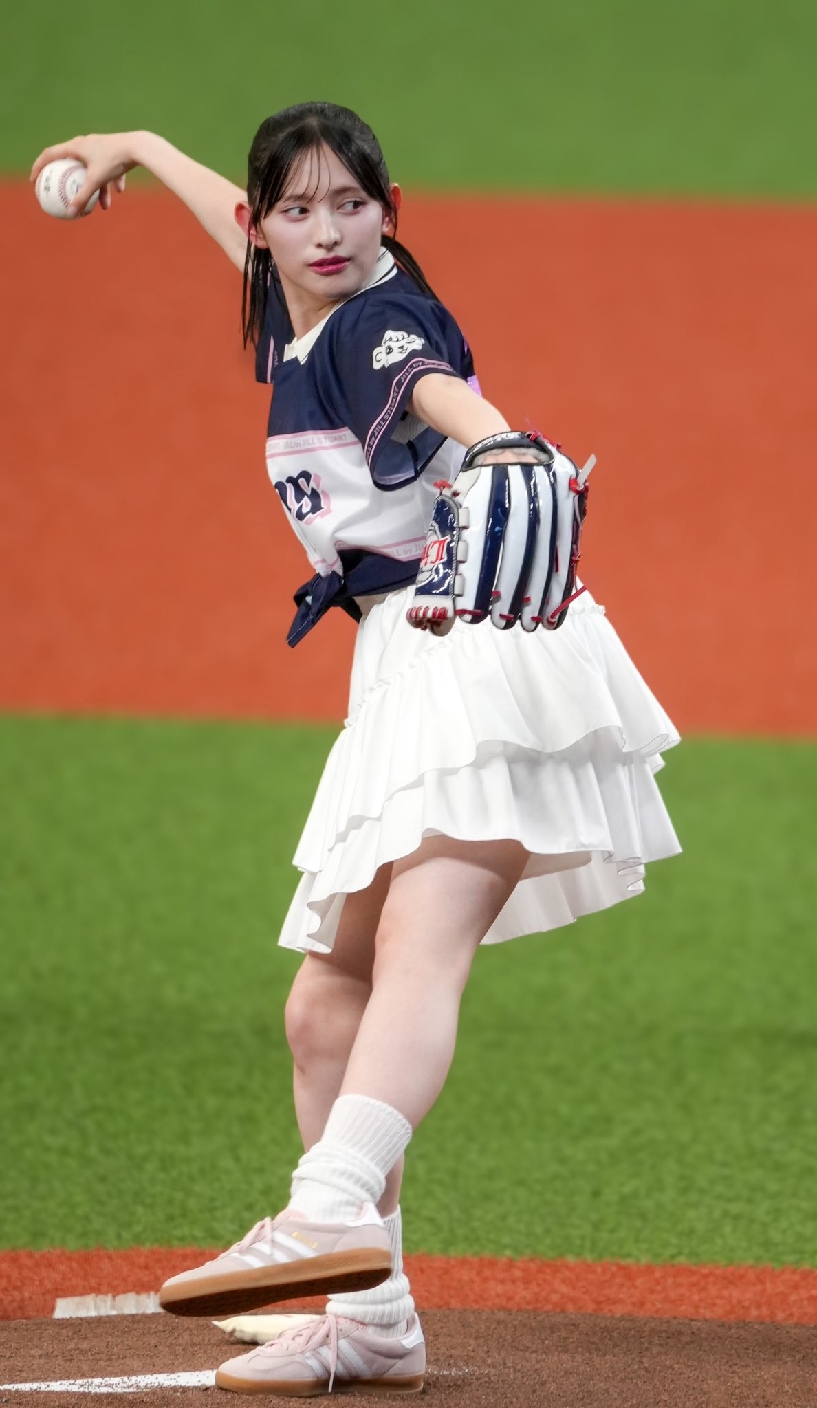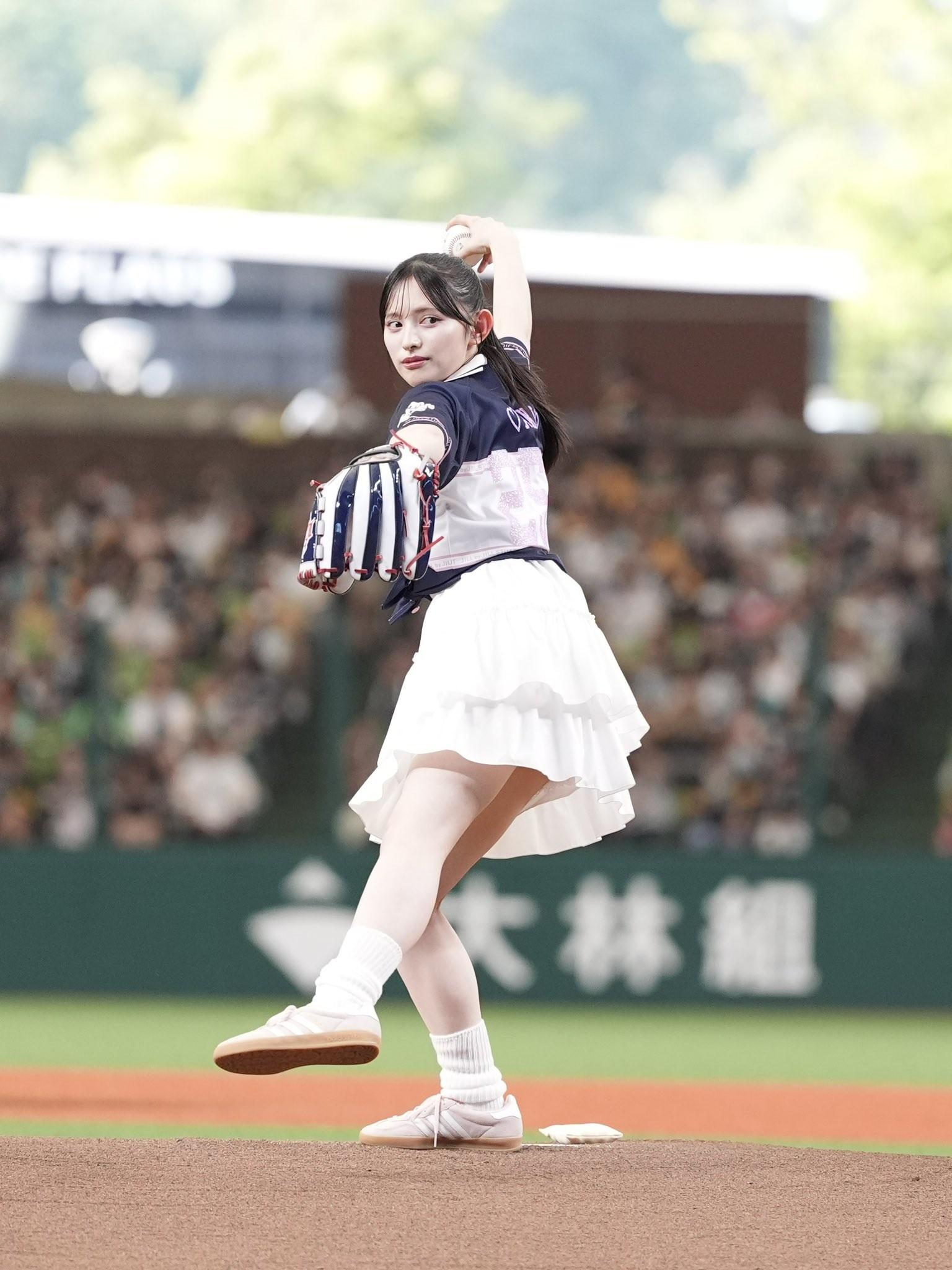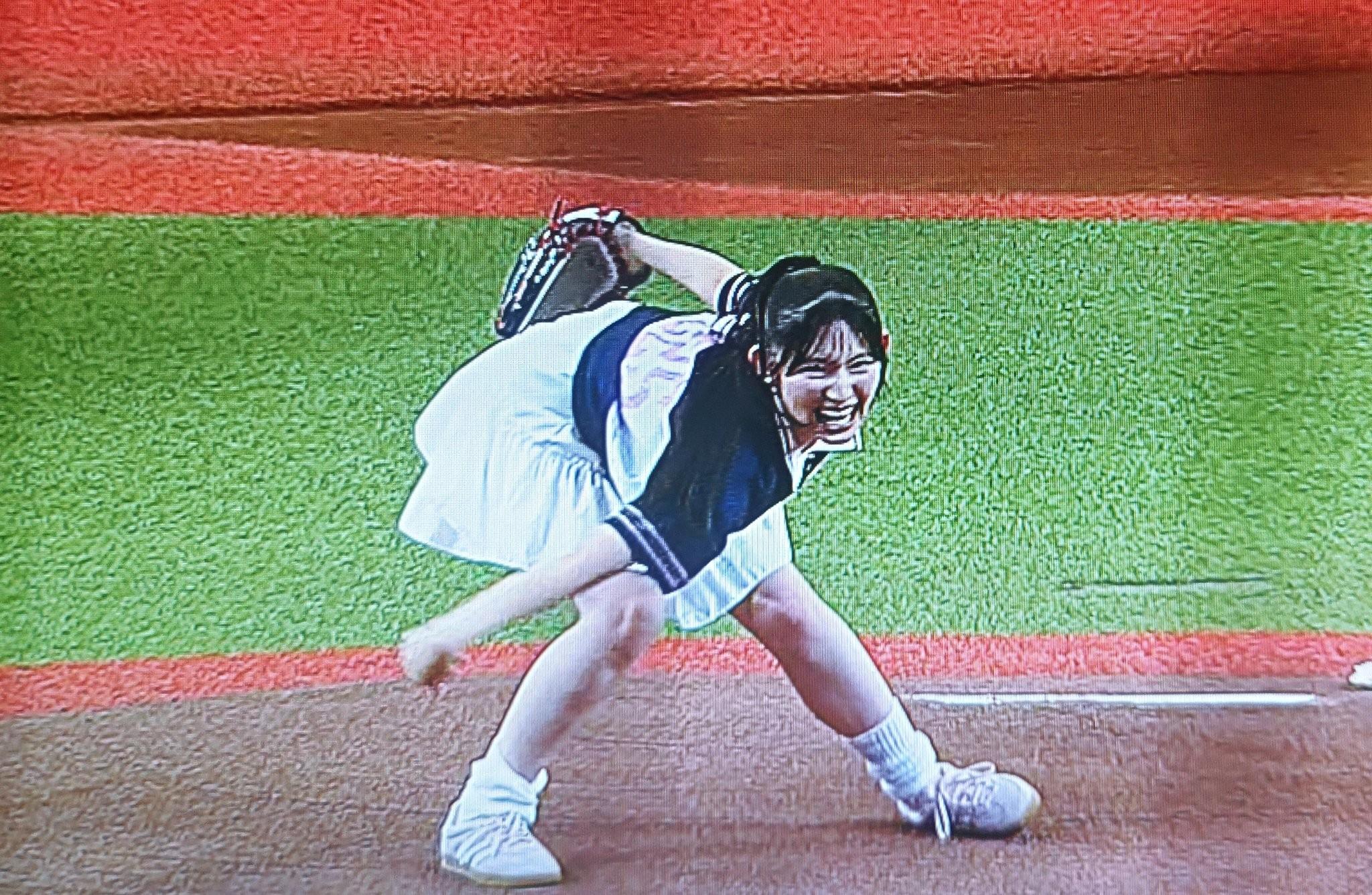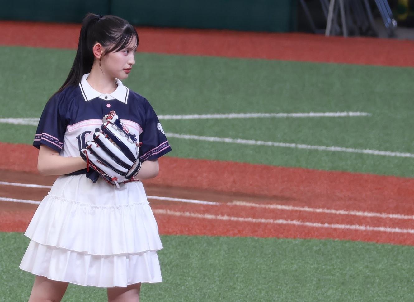 人気アイドルが白スカートで豪快投球 ピョンピョン大喜び…限定ユニ姿で球場虜