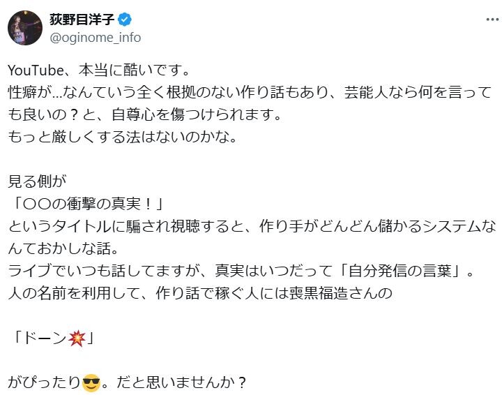 荻野目洋子、YouTubeの嘘まとめ動画に激怒「本当に酷いです。性癖が…なんていう全く根拠のない作り話」