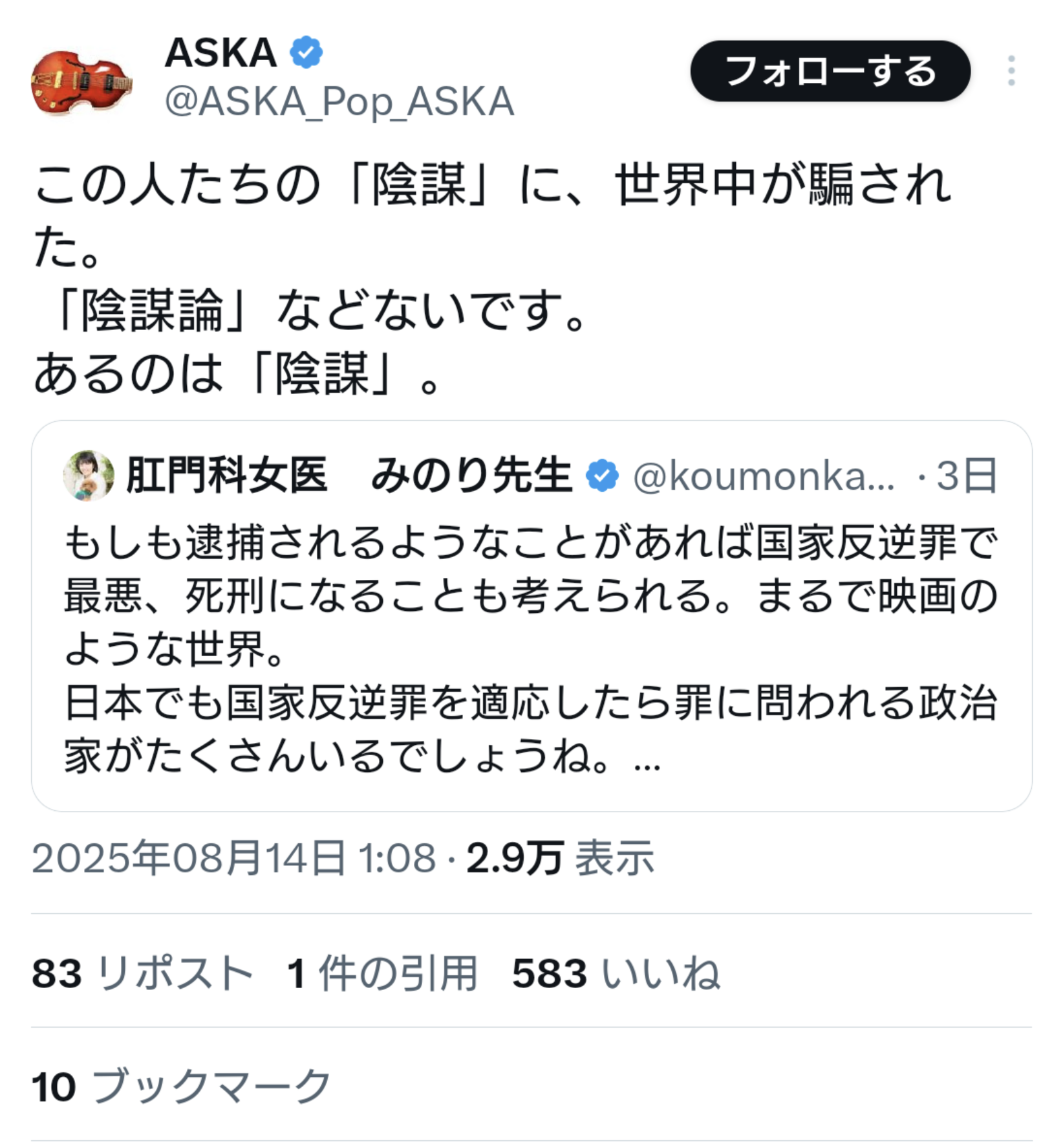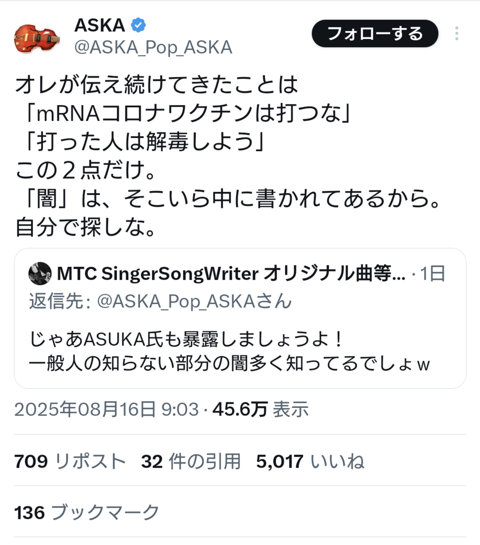 【悲報】チャゲアスのASKAさん、謎のポストを連発してしまう