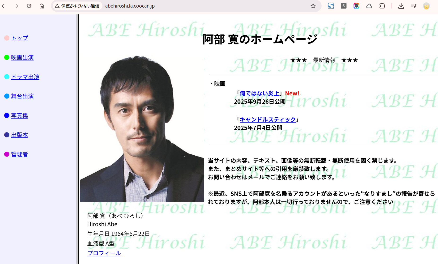 俳優・阿部寛さんの公式サイト「阿部寛のホームページ」は、1990年代にタイムスリップしたかのような、古風かつシンプル・軽量なサイト。URLは「http://abehiroshi.la.coocan.jp/」であり、LaCoocanでホスティングされている。