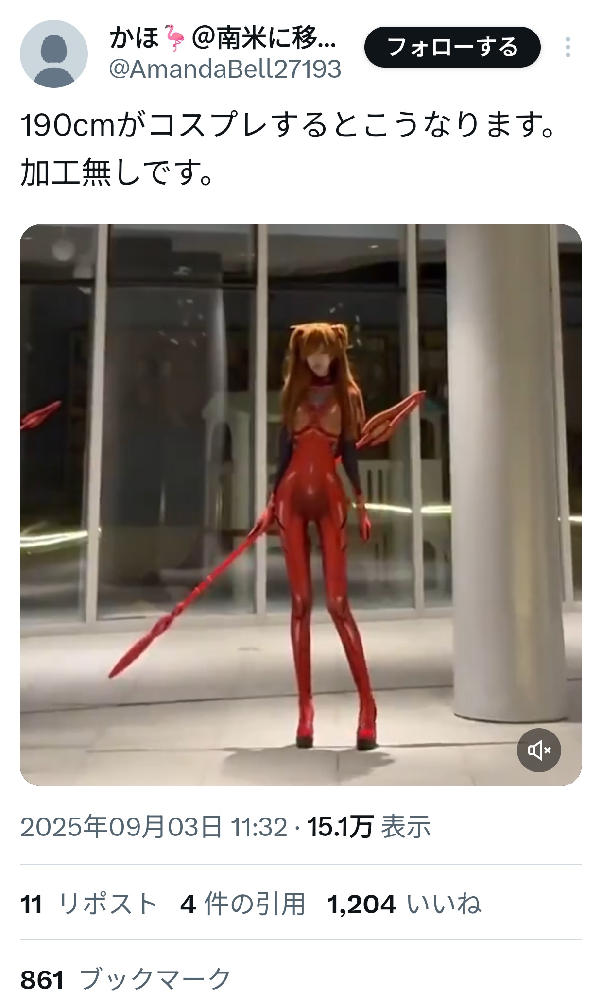 【悲報】190cm女さんがコスプレ→あまりにも不気味すぎていいねが付かない(画像あり)