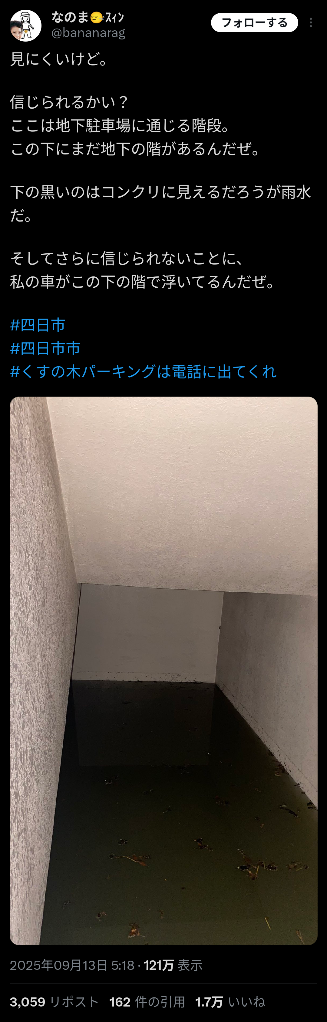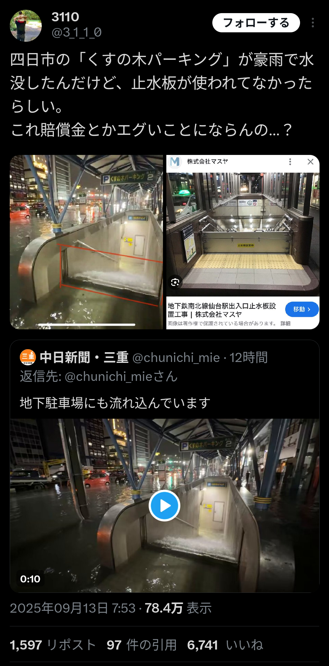 【悲報】四日市パーキング、止水板を閉め忘れて数百台の車を水没させてしまう😭😭😭