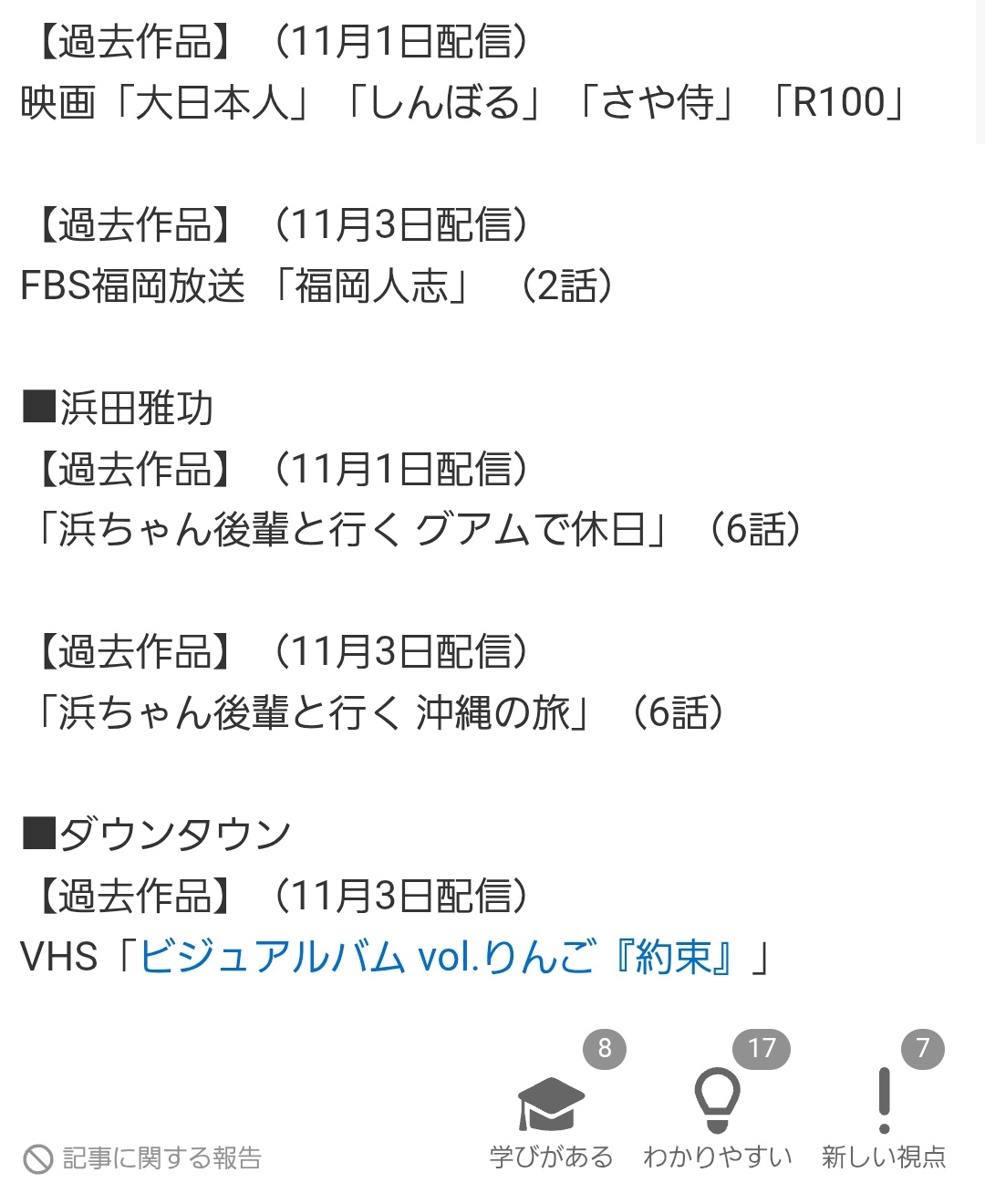 11月3日以降は毎週月曜に過去作品、水曜と金曜に松本のオリジナル作品を更新する。その後も松本の月1~2回の生配信(土曜日、不定期)なども実施予定といい、浜田雅功の新コンテンツは追って発表するとしている。