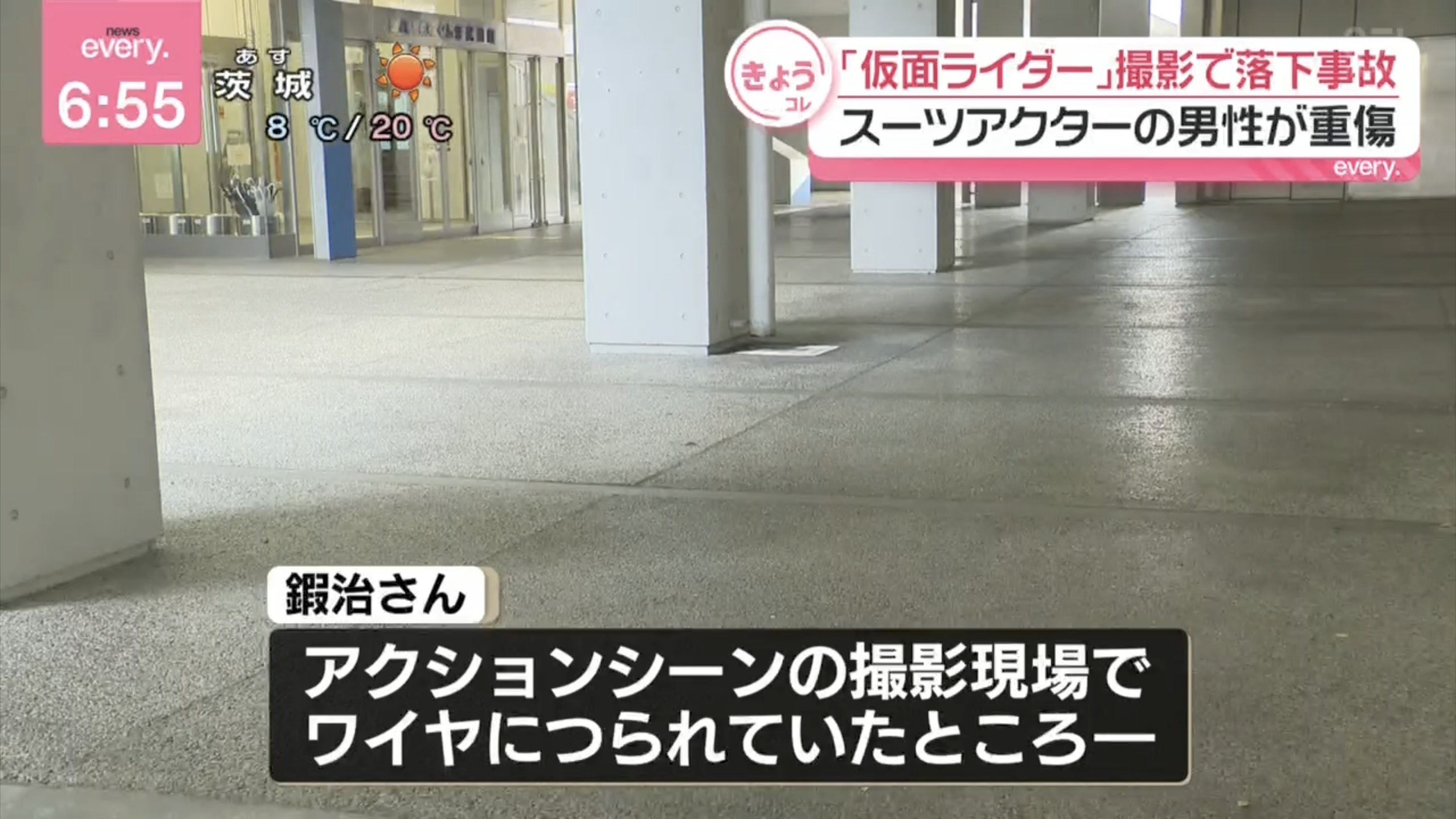 東映は公式サイトで「2025年11月6日午前8時頃、当社が製作しております特撮番組『仮面ライダーゼッツ』のアクションシーンの撮影において、出演するスーツアクター鍜治洸太朗さんが、吊られた状態から壁を蹴る等の演技リハーサルを行う中、高さ2メートルから落下し、負傷いたしました」と報告した。