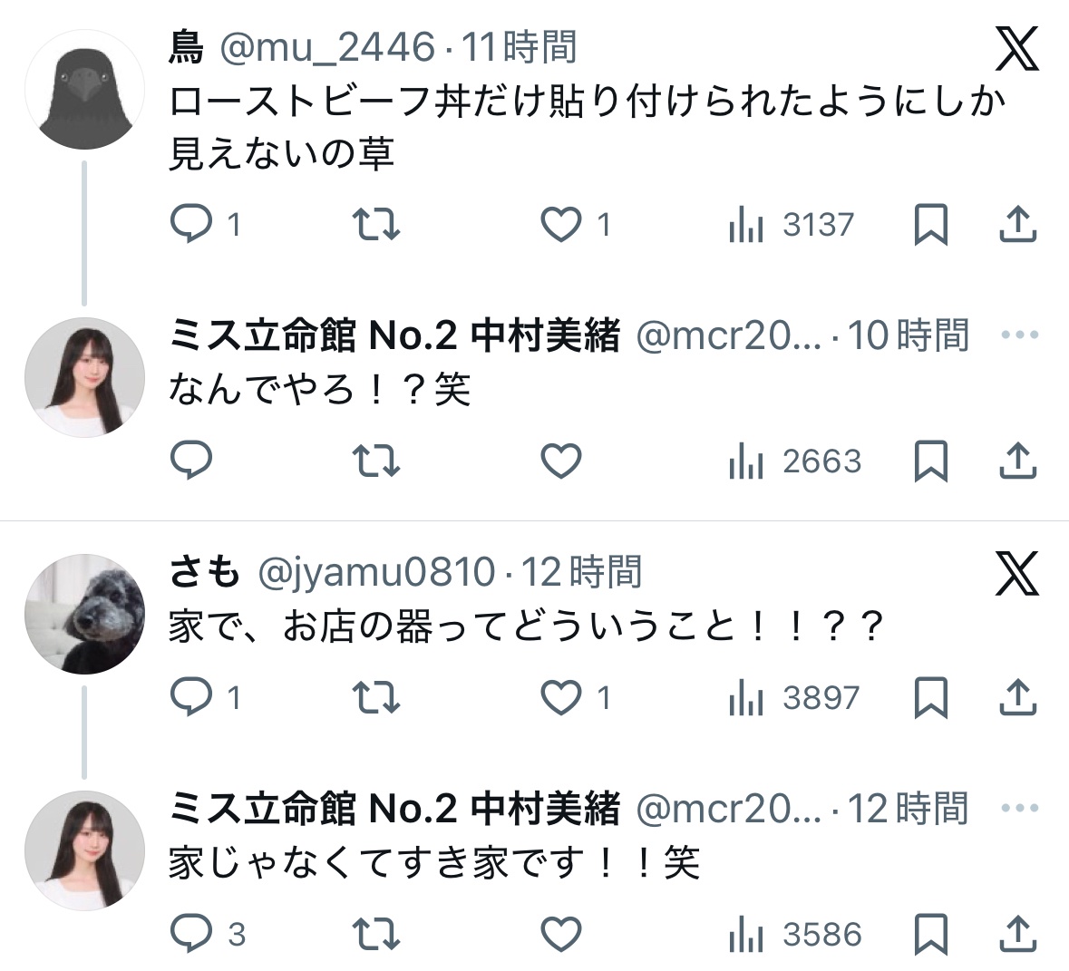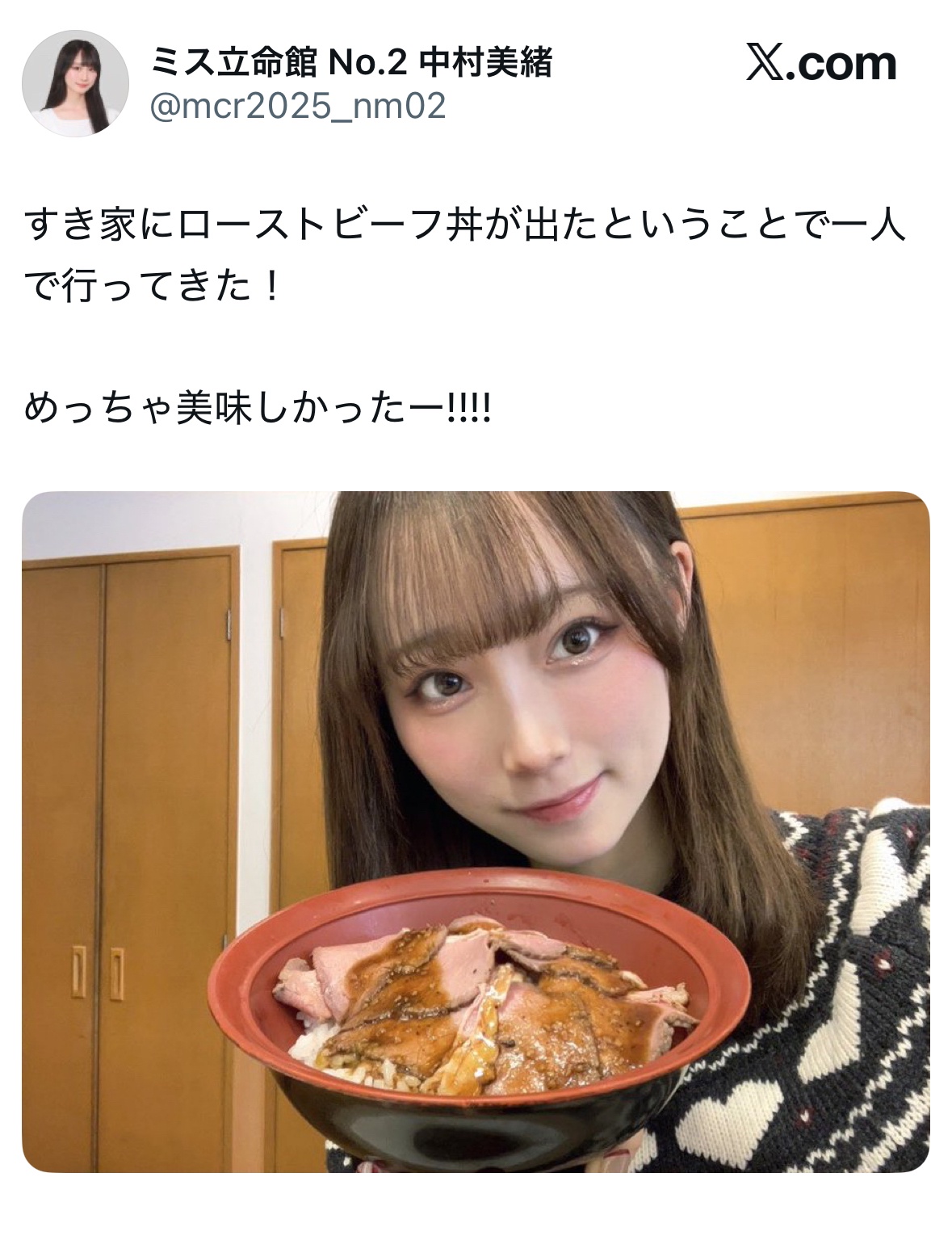 — ミス立命館 No.2 中村美緒 (@mcr2025_nm02) November 16, 2025