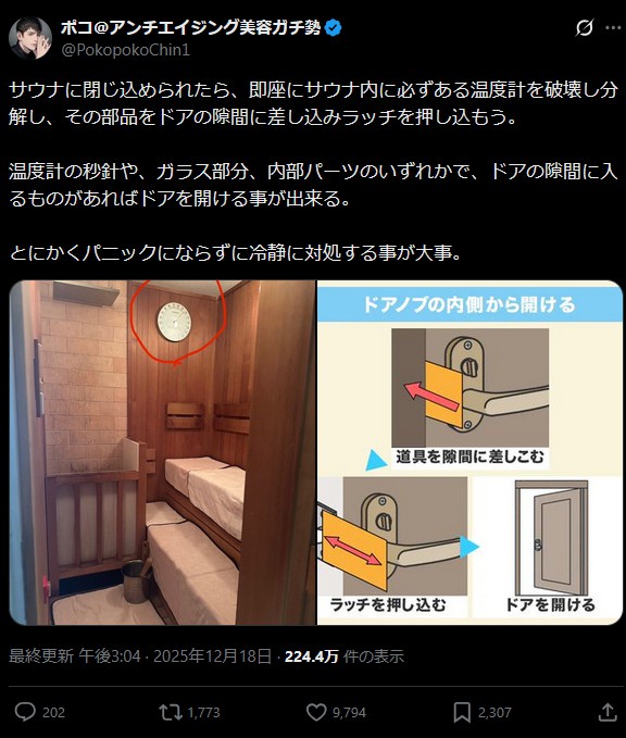 サウナに閉じ込められたら、即座にサウナ内に必ずある温度計を破壊し分解し、その部品をドアの隙間に差し込みラッチを押し込もう。
