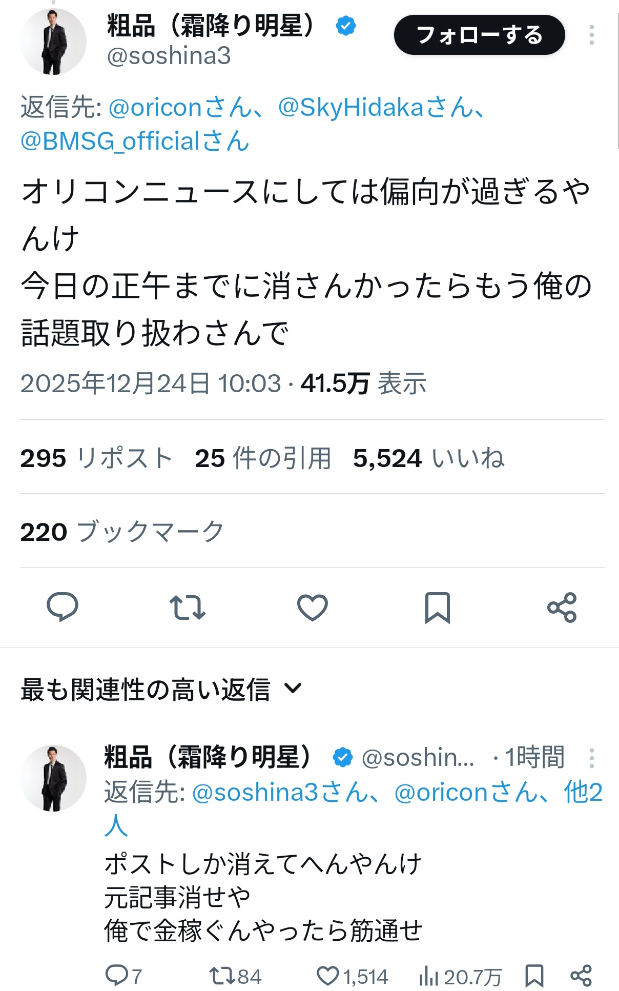 粗品、オリコンニュースにブチギレ「記事消せや」