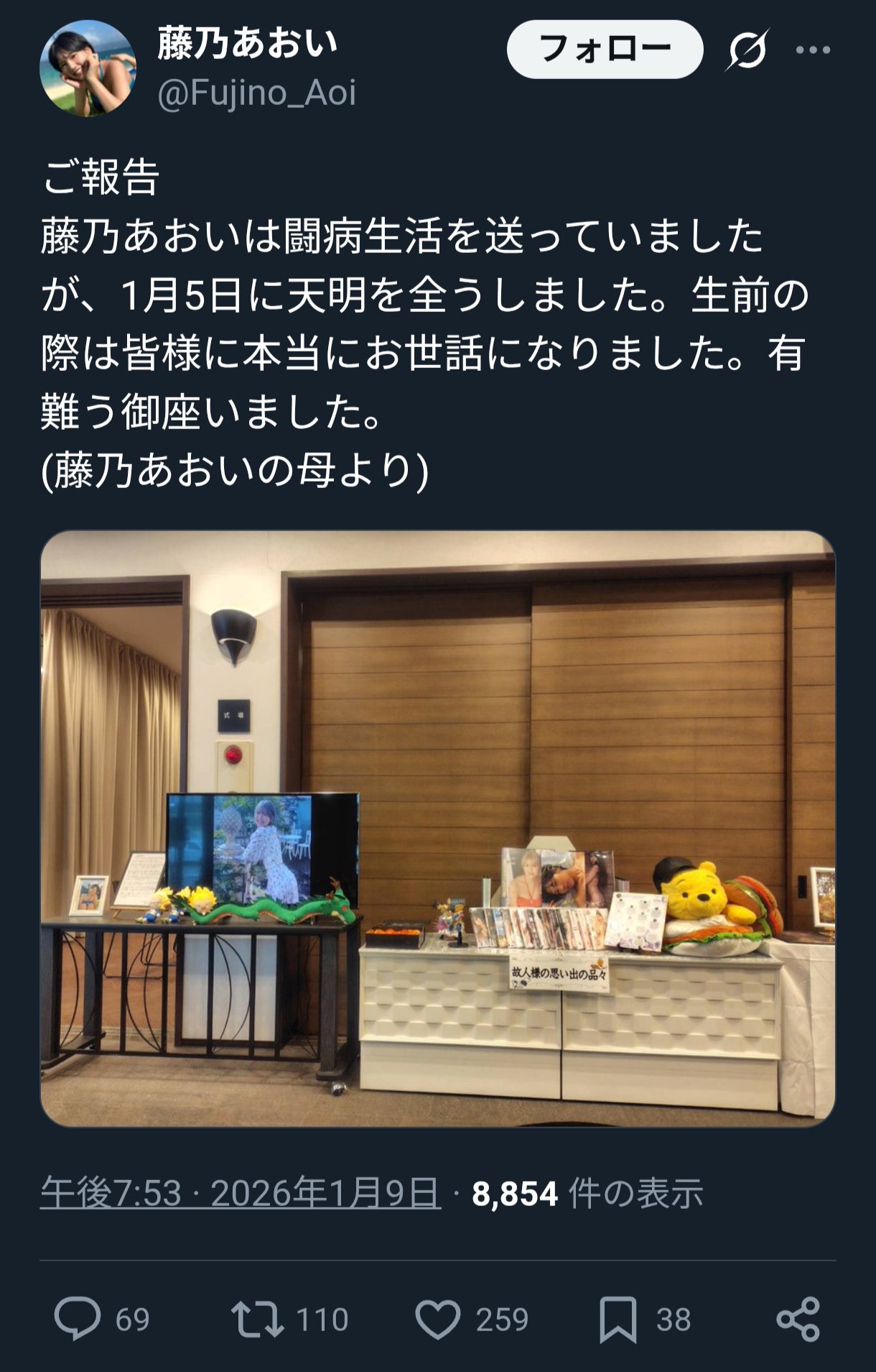 藤乃さんのXを通じ「ご報告 藤乃あおいは闘病生活を送っていましたが、1月5日に天明を全うしました。生前の際は皆様に本当にお世話になりました。有難う御座いました。(藤乃あおいの母より)」と訃報が伝えられた。