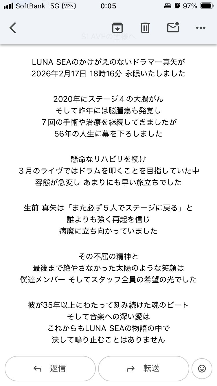真矢さんは昨年9月、脳腫瘍と診断されたことを公表。2020年にステージ4の大腸がんが見つかっていたが闘病しながらライブ活動を続けていたことも同時に明らかにした。同月27日には地元の神奈川県秦野市で行われた祭りに参加し「必ず復帰してドラムのスティックを持てる日が来ると思うので、それまでちょっと待っていてください」とファンに呼びかけていた。昨年11月9日、バンド主催の音楽祭「LUNATIC FEST.」に登場したのが、最後の公の場となった。