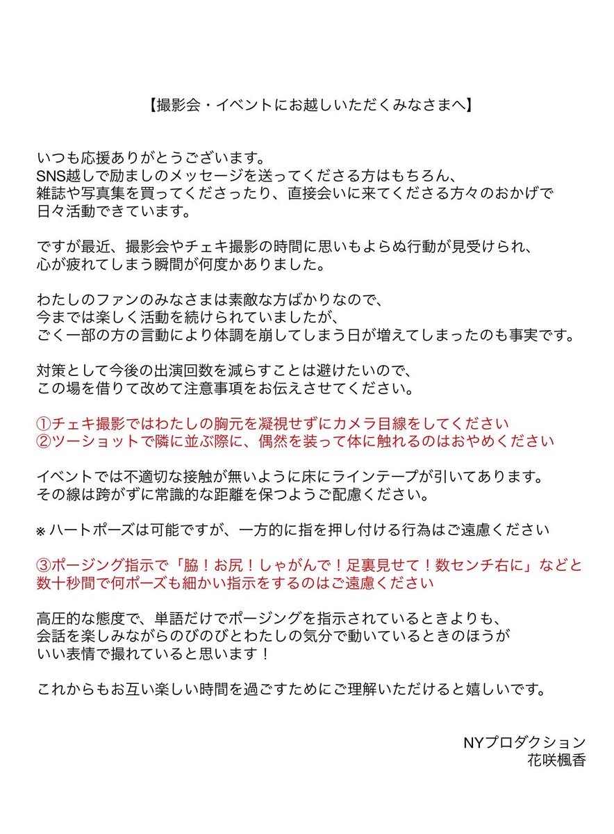 今回の投稿の背景について「高圧的な態度で、単語だけでポージングを指示されているときよりも、会話を楽しみながらのびのちぼわたしの気分で動いているときのほうがいい表情で撮れていると思います!」と説明。「これからもお互い楽しい時間を過ごすために、ご理解いただけると嬉しいです」と結び、ファンとの信頼関係の再構築を訴えた。