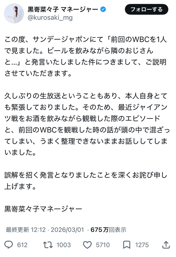 【悲報】グラビアアイドル(22)、「前回のWBCは1人でビールを飲みながら隣のおじさんと見た」→謝罪