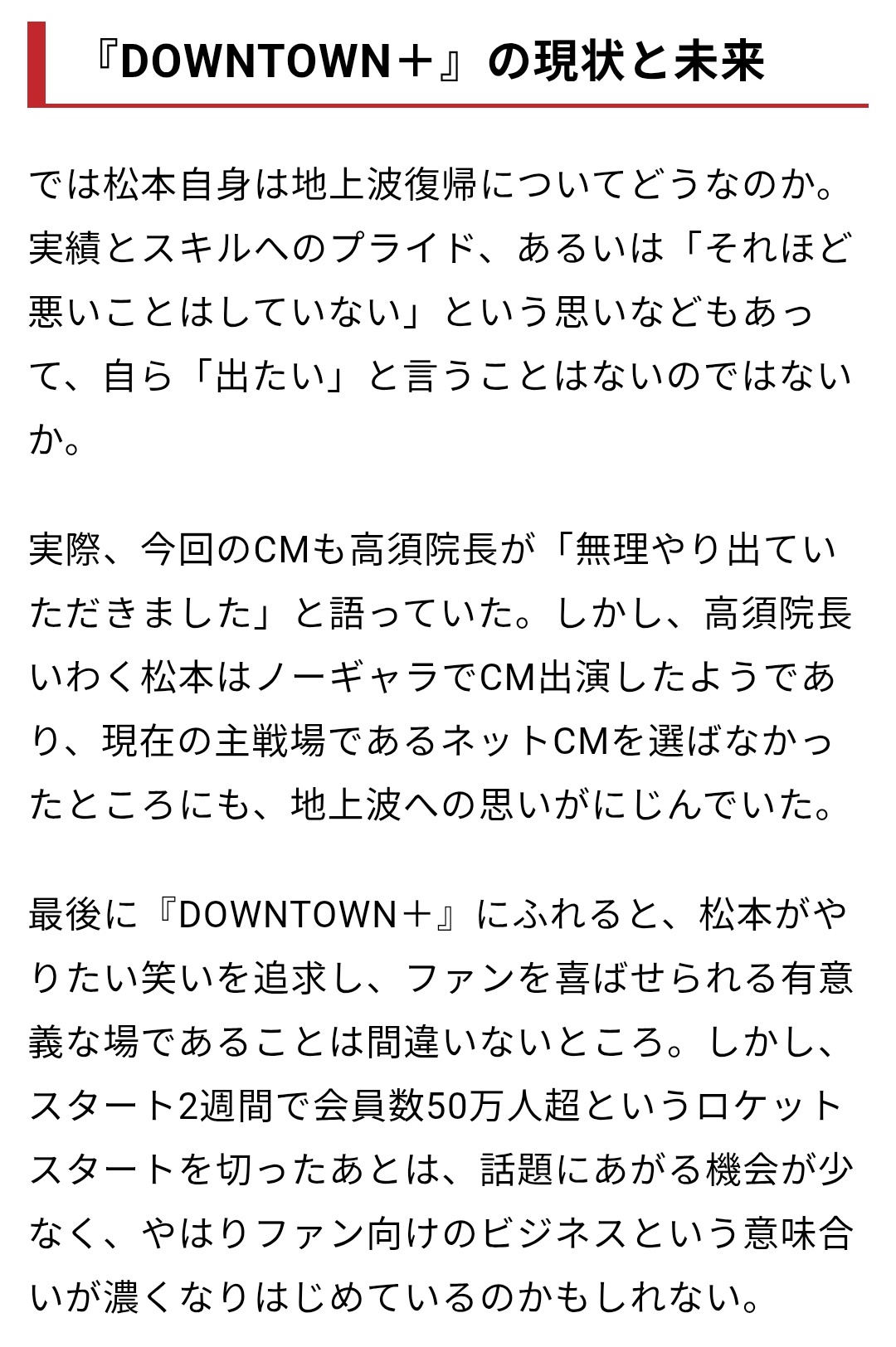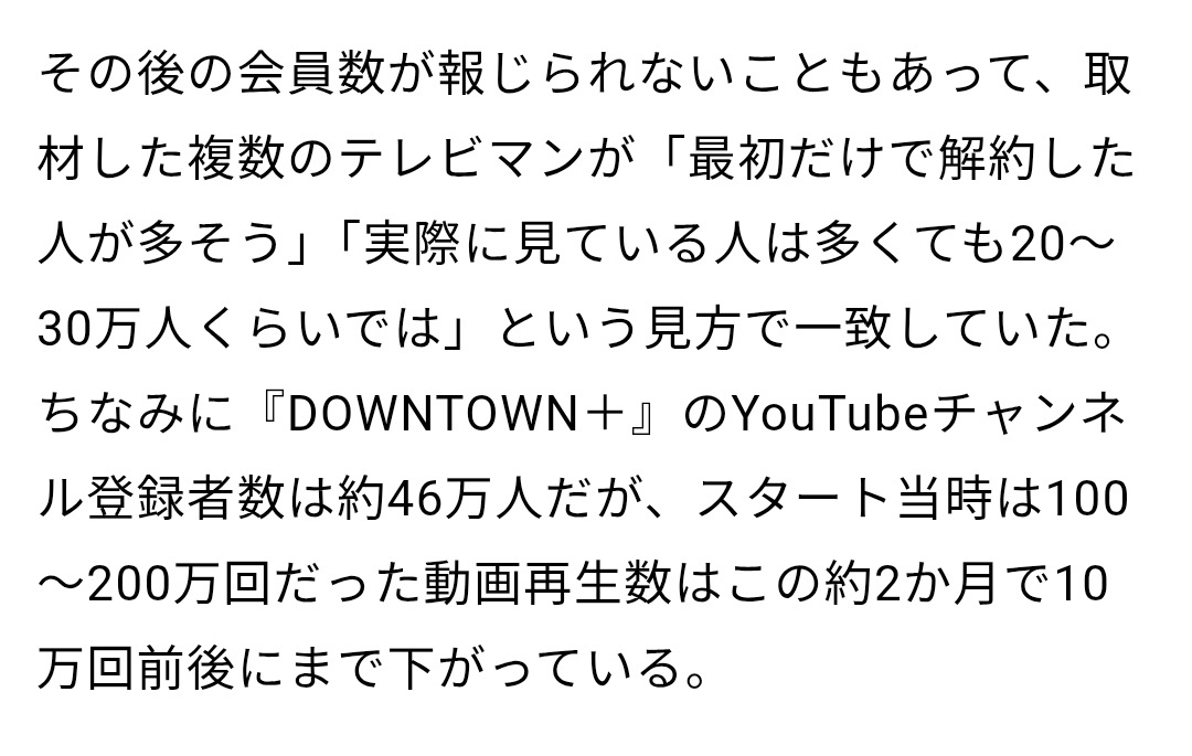 ちなみに『DOWNTOWN+』のYouTubeチャンネル登録者数は約46万人だが、スタート当時は100~200万回だった動画再生数はこの約2か月で10万回前後にまで下がっている。